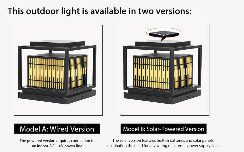 Voltage: AC 110-240V (Wired version) / DC 3.2V (Solar-powered version).