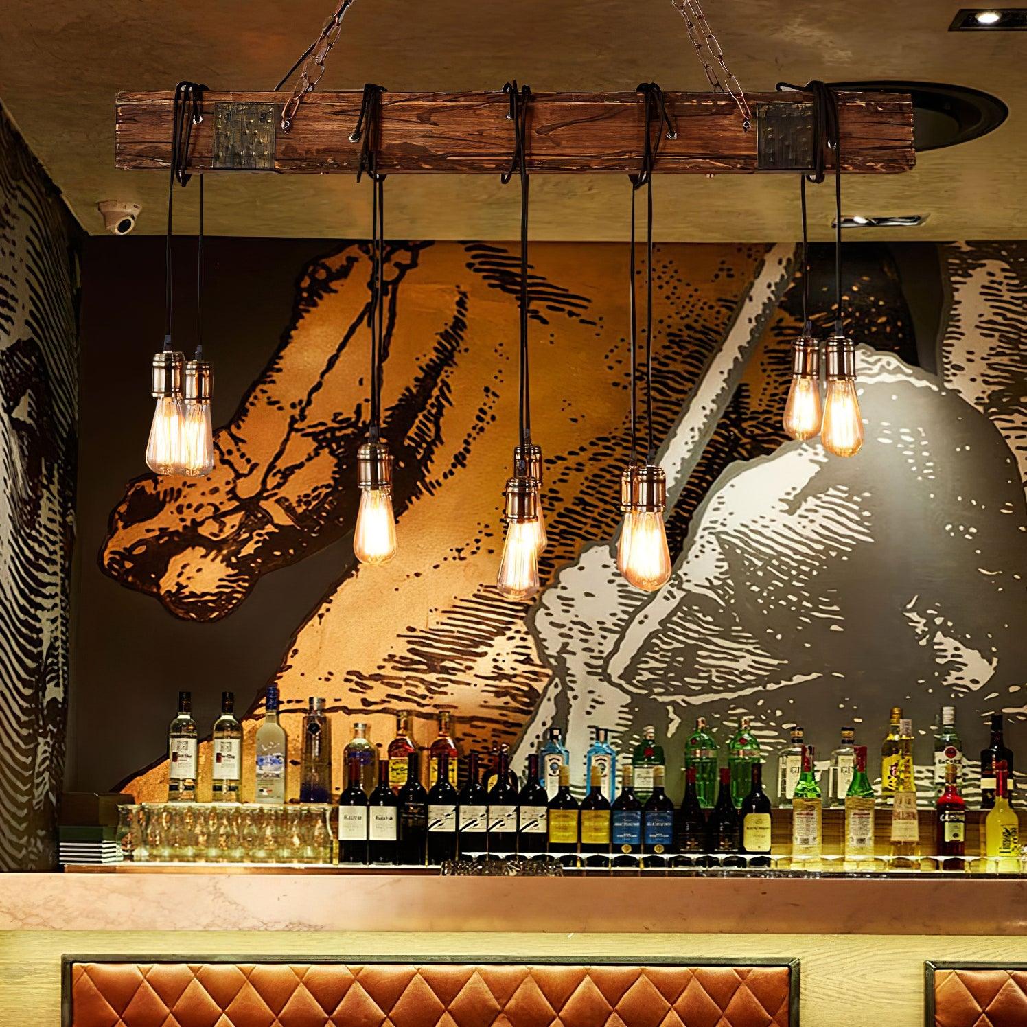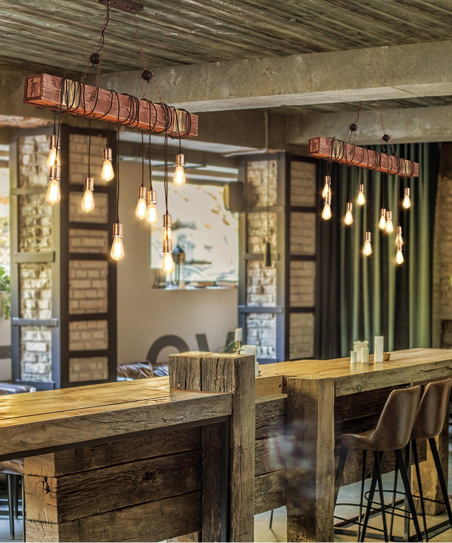 Creating a sense of pristine elegance to home interior with this 10-light island pendant light. Reminiscent Edison bulbs wrapping around the dark reclaimed wood beam creates this masterpiece. Rust round iron balls with chains attach the light fixture to rectangular canopy, adding handsome sophistication and elegance to this design. Over a kitchen island, dining table and pool table or in a living room, it will lend that farmhouse charisma and rustic style.