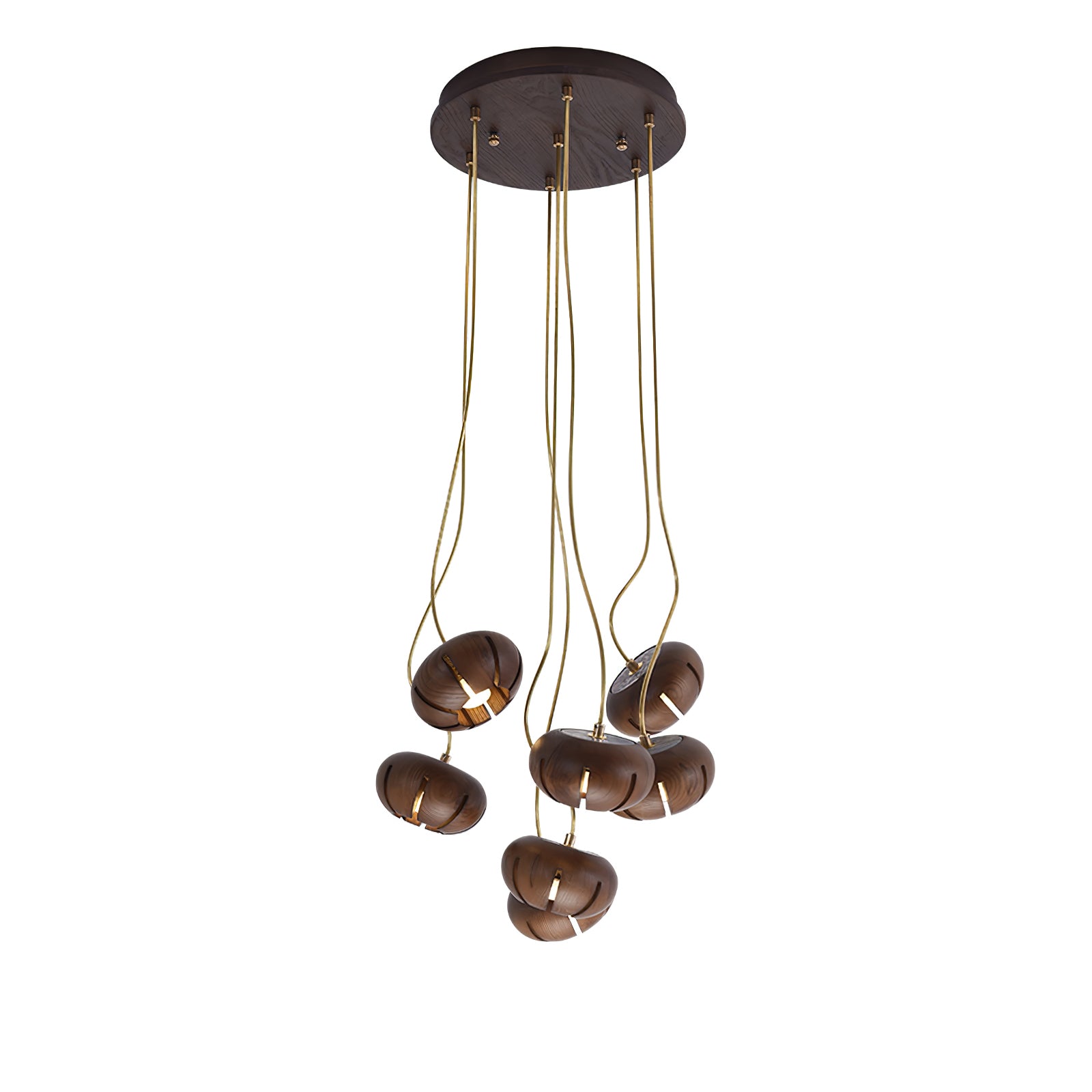 Inspired by the organic beauty of nature, the Pumpkin Cluster Chandelier brings the warmth and richness of wood into a modern lighting design. The cluster of wooden "pumpkins" suspended from a sleek, dark circular canopy evokes the essence of autumnal harvests, infusing spaces with a rustic yet contemporary charm. Each wooden element is carefully crafted to resemble the natural contours of a pumpkin, creating a harmonious blend of natural forms and modern aesthetics. This chandelier is perfect for those who appreciate the beauty of natural materials and want to make a bold yet warm statement in their living space.